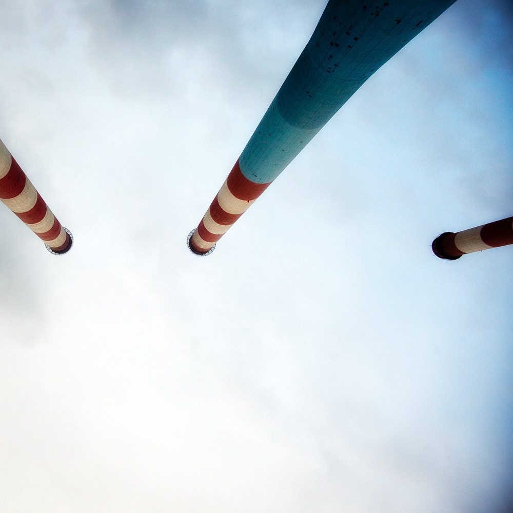 Les célèbres cheminées de la centrale thermique de Ponteau se sont éteintes il y a quelques années, leur valeur symbolique en a été renforcée. Motif paysagé, les fûts bicolores s’élancent et forment des phares pour les marins. Le photographe en traque les silhouettes visibles de si loin qu’on en perd l’échelle et qu’elles apparaissent parfois minuscules. Question de point de vue : une fois situé à leur base, le renversement d’une contreplongée leur donne l’allure vertigineuse de piles soutenant le manteau des nuages. Alain Sauvan sait à quel point les photographes de la Nouvelle Vision, dans les années 1920-30, ont aimé célébrer la modernité en hypertrophiant les formes par les effets de perspectives.