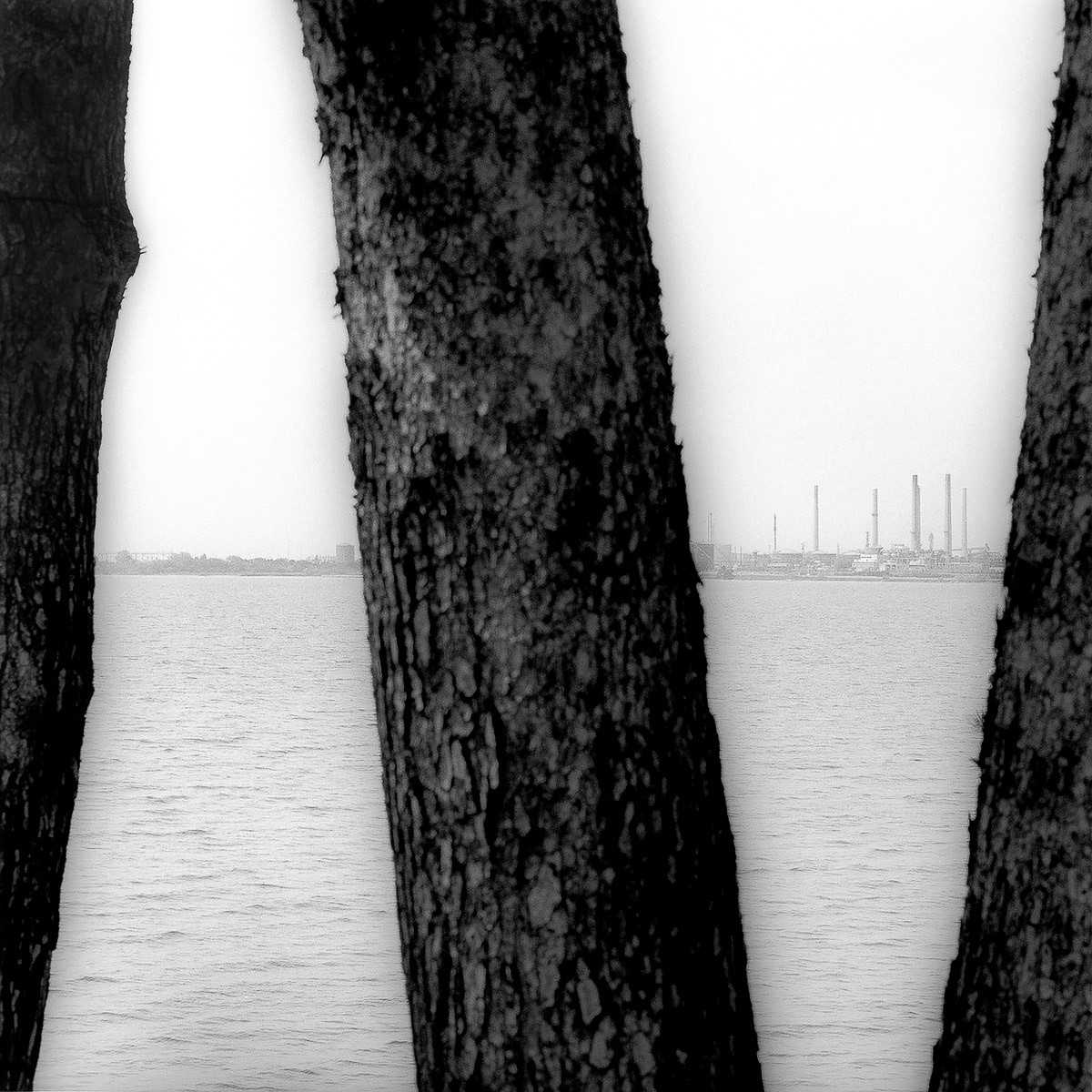 Le cadrage serré des images qu’il compose sait jouer sur l’imprévu des compositions, en rejetant tout pittoresque, toute narration. Il montre comment son œil apprivoise le paysage au fur et à mesure, comment de la nature il glisse vers l’homme ou plutôt vers des traces d’humanité (fragment d’usine, route, barrière, mur…). Le noir et blanc est là pour imposer des lignes, que rien ne pourrait perturber. Le tronc d’arbre est alors l’égal de la cheminée d’usine. Le format carré rejoint cette idée, comme une assurance de stabilité. Mais, quand on s’y arrête, quand on prend le temps, on s’aperçoit à quel point tout est fragile… une branche, un reflet, une ombre, le vent, l’écume…Tout n’est qu’air, fluidité, vibration, respiration. Et c’est peut-être là que se trouve la finesse d’Alain Sauvan… dans ce travail constant sur l’interstice du regard… cet entre deux du regard qui se pose et du regard qui lit.